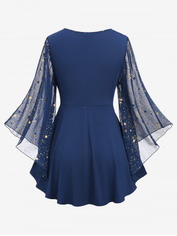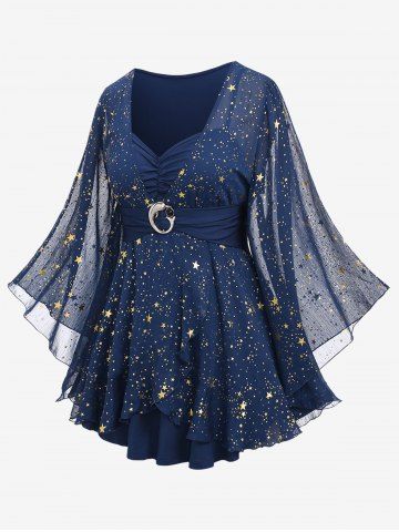 C*****n5Plus Size Foil Stamping Star Print Buckle Ruched Sheer Layered T-shirtColor: DEEP BLUE Size: 3X | US 22-24This is a very fun yet comfortable top. Very magical I love it.