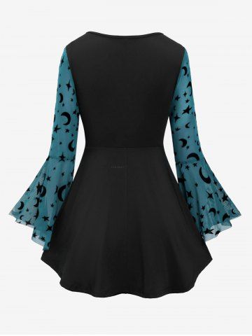 Plus Size Gothic Moon Star Print Mesh Panel Bell Sleeves Ruched Chain Tassel Long Sleeves T-shirt - Sky Blue - L | Us 12