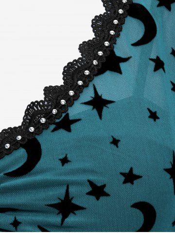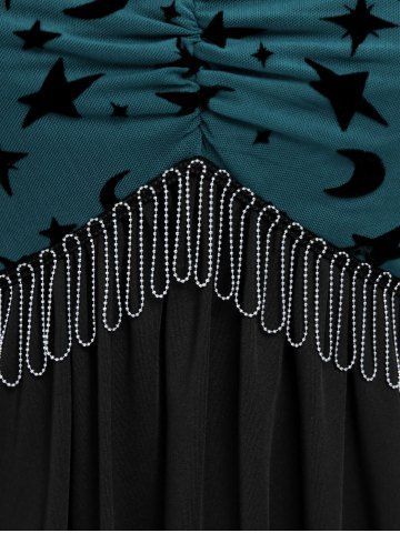 a*****75Plus Size Gothic Moon Star Print Mesh Panel Bell Sleeves Ruched Chain Tassel Long Sleeves T-shirtColor: DEEP RED Size: 4X | US 26-28This top is beautiful and fits perfectly. I haven't gotten to wear it out yet, but it's going to be a compliment-catcher, I can already tell. Love the star and moon motif, and the tiny beaded trim is an elegant touch.