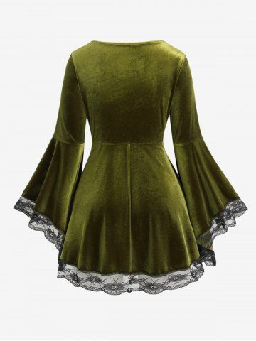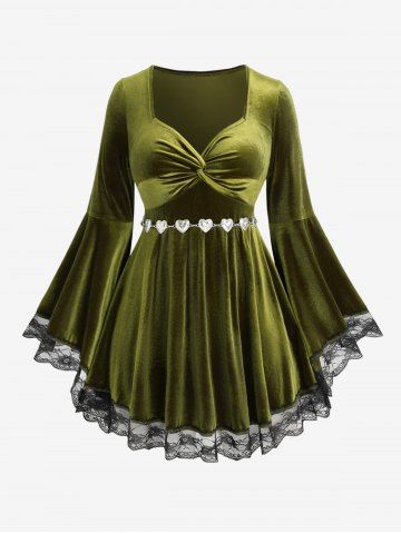 p*****p5Plus Size Flare Sleeves Lace Trim Twist Heart Chain Belted Velvet TopColor: GREEN Size: 1X | US 14-16omg.... absolutely love this top.... it looks amazing on.... would recommend this for any curvy body type... so soft and stretchy and gives you all the right curves.