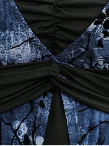 Plus Size Flower Flocking Rivet Lace Trim Ruched Twist Flare Sleeves 2 In 1 Top - Deep Blue - 2x | Us 18-20