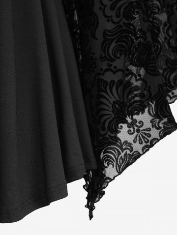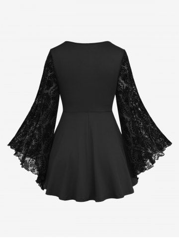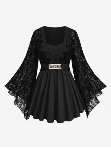 S*****s5Plus Size Lace Applique Ruched Buckle Floral Mesh Flare Sleeves T-shirtColor: BLACK Size: 3X | US 22-24I love this shirt! It fits so well. I was afraid of it sagging or being too big in places but it is really perfect. I love the thickness of the sleeves. They’re not thick but also not completely sheer. It is very comfortable.