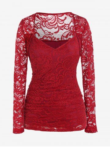 Plus Size Lace Panel Sweetheart Neck Tee - Deep Red - 1x | Us 14-16