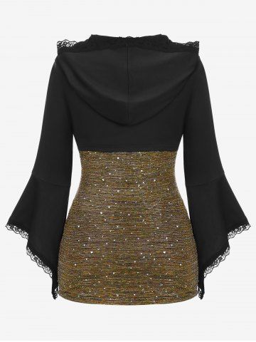 Plus Size Lace Trim Chains Textured Ruched Bell Sleeves Hooded T-shirt