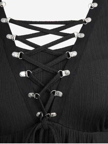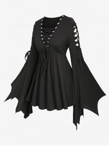 Plus Size Lace Up Asymmetrical Braided Flare Sleeves Ribbed Top - Black - 3x | Us 22-24