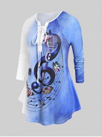 L*****D5Plus Size Lace Up Ombre Color Music Notes Print TeeColor: BLUE Size: 3XBonjour,celui là il est vraiment magnifique .fidel a la taille,de tres belles couleur authentiques comme sur la photo.je recommande.