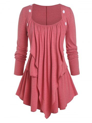 w*****l3Plus Size Layered Draped Buttoned Round Hem Tunic TeeColor: LIGHT PINK Size: 1Xthis shirt is nice arrived in nice timing too. the ruffles was different than expected but still love it