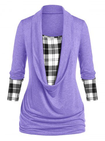 B*****b5Plus Size Plaid Draped Ruched Long Sleeve TeeColor: PURPLE Size: 3XGreat value...would definitely recommend! The fabric is so soft and comfortable...Perfect fit and shipped fast! Beautiful, exactly as pictured. Amazing quality! fits exactly by size!