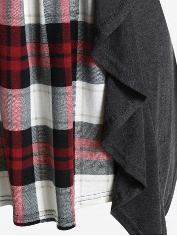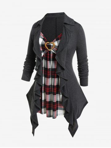 s*****e4Plus Size Plaid Faux Twinset Ruffled Asymmetric TeeColor: DARK GRAY Size: 2X | US 18-20I really like this blowes it's a tank top and a Shawl sewn together and it's comfy and very flattering to my chest and my husband loves it very much I just wish that I maybe got a size down but its fine and I also wish that you could change sizes easier but it's ok still love it and still looking good
