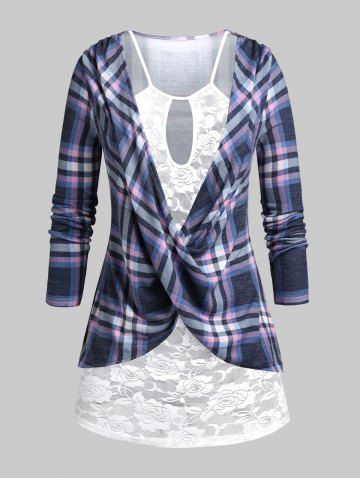 B*****b5Plus Size Plaid Front Twist Keyhole 2 in 1 TopColor: PURPLE Size: 3XBeautiful top. Material is soft and comfortable, perfect fit, shipped fast and packaged nicely! Another beautiful winner! Lace top is attatched on the inside. Great quality and design!