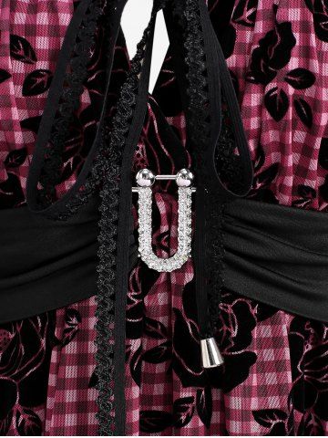 Plus Size Plaid Rose Printed Tie Buckle Flare Sleeves T-shirt - Light Pink - 4x | Us 26-28
