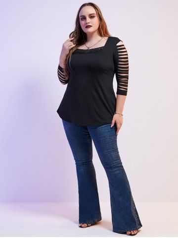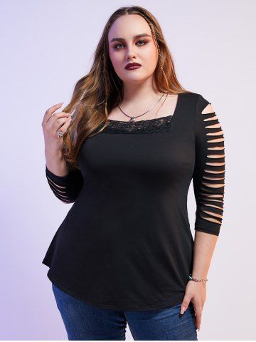 a*****.5Plus Size Ripped Sleeve Lace Panel TeeColor: BLACK Size: 4X | US 26-28Nice top, it can be used on different occasions. It fits well and it is comfortable. I would recommend it.