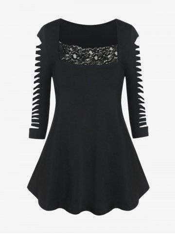 a*****.5Plus Size Ripped Sleeve Lace Panel TeeColor: BLACK Size: 4X | US 26-28Nice top, it can be used on different occasions. It fits well and it is comfortable. I would recommend it.