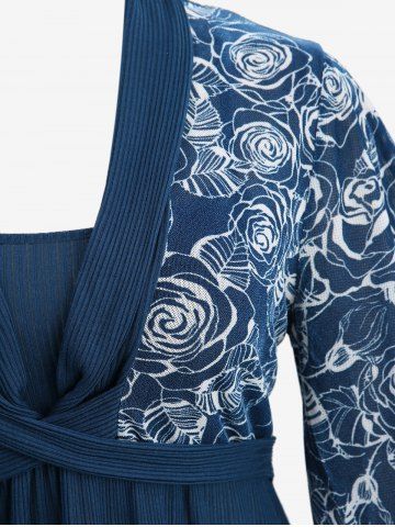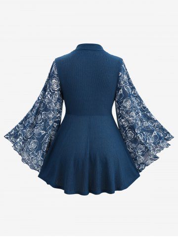 l*****85Plus Size Rose Flower Leaf Print Ribbed Textured Patchwork Flare Sleeve TopColor: BLUE Size: 1X | US 14-16love the Bell sleeves the color the material everything about is awesome