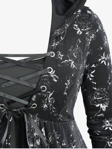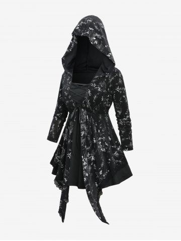 Plus Size Rose Flower Print Lace Up Layered Asymmetric Hooded Long Sleeves Top - Black - 2x | Us 18-20