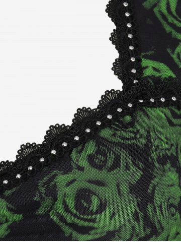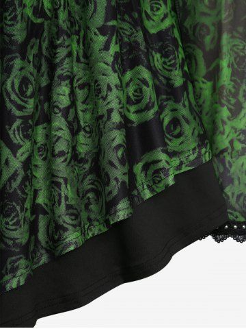 Plus Size Rose Flowers Print Rivet Lace Trim Ruched Patchwork Flare Sleeve Top - Green - 3x | Us 22-24