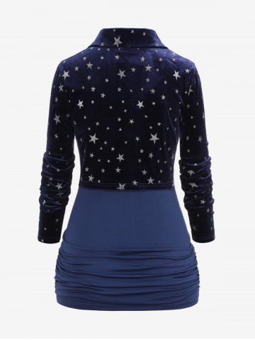 j*****y5Plus Size Ruched Lace Trim Buttons Cami Top and Silver Stamping Stars Print Crop TopColor: DEEP BLUE Size: 4X | US 26-28It's a little short to be a dress.... lol... but I really like the way it feels....