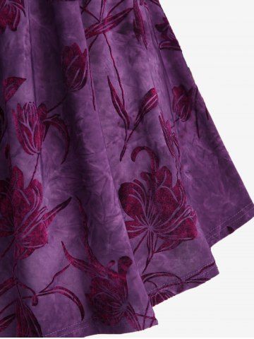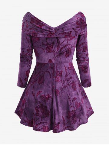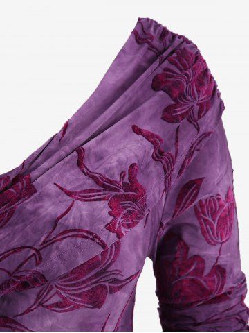 Plus Size Ruched Off The Shoulder Tulip Flower Flocking Glitter Sparkling Star Buckle Velvet Top - Purple - L | Us 12