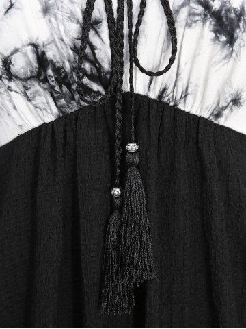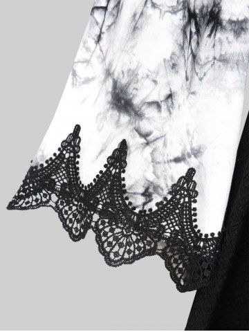 Plus Size Ruffle Neck Ink Tie Dye Crochet Applique Tied Tassel Patchwork Textured Bell Sleeves Top - Black - 4x | Us 26-28