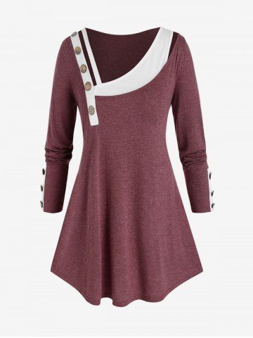Plus Size Skew Neck Mock Button Paneled T Shirt - Red Wine - 3x