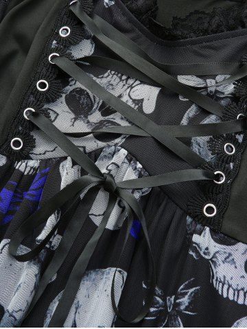 Plus Size Skull Bowknot Heart Printed Mesh Lace Up Flare Sleeve Handkerchief Top