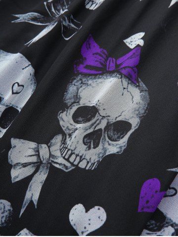 d*****g5Skull Bowknot Heart Print Mesh Handkerchief Top and Lace Panel Flare Pants with Lace-up Plus Size OutfitColor: BLACKI love this product the fit was great and got here fast.
