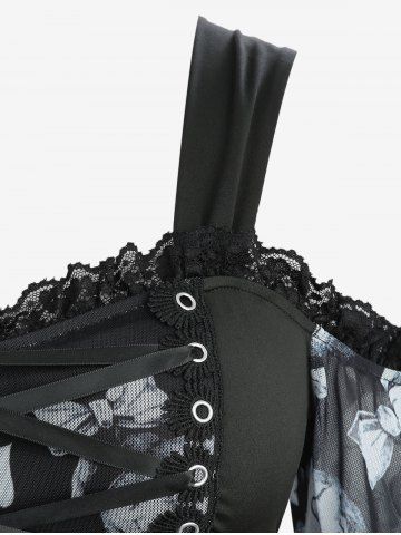 d*****g5Skull Bowknot Heart Print Mesh Handkerchief Top and Lace Panel Flare Pants with Lace-up Plus Size OutfitColor: BLACKI love this product the fit was great and got here fast.