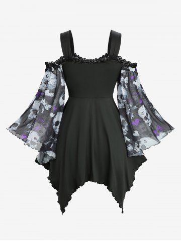 d*****g5Skull Bowknot Heart Print Mesh Handkerchief Top and Lace Panel Flare Pants with Lace-up Plus Size OutfitColor: BLACKI love this product the fit was great and got here fast.