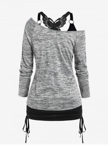h*****95Plus Size Space Dye Skew Neck Tee and Butterfly Lace Cinched Ruched Top SetColor: GRAY Size: 1X | US 14-16Love it and you can wear it separately which is even better