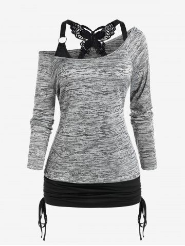 h*****95Plus Size Space Dye Skew Neck Tee and Butterfly Lace Cinched Ruched Top SetColor: GRAY Size: 1X | US 14-16Love it and you can wear it separately which is even better