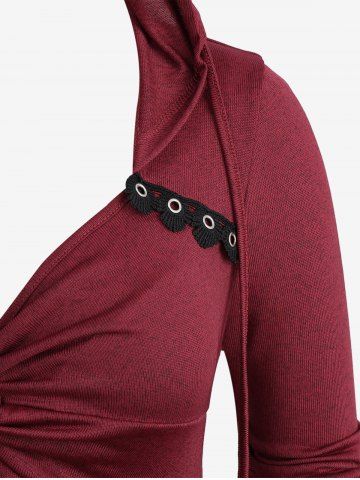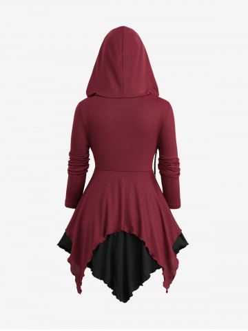 s*****45Plus Size Twist Lace Trim Drawstring Hooded Layered Handkerchief Long Sleeve TopColor: DEEP RED Size: 2X | US 18-20The shirt is a nice quality, the color combo is very nice and flattering as well