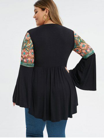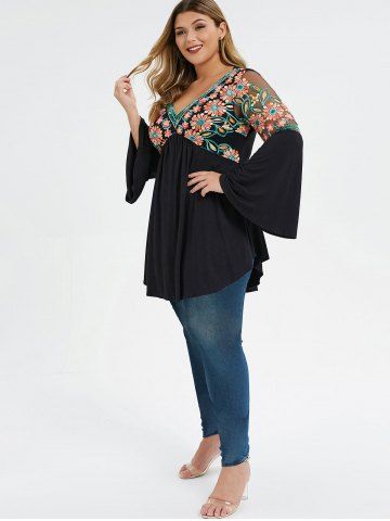 Plus Size V Neck Bell Sleeve Embroidery T-shirt - Black - L | Us 12