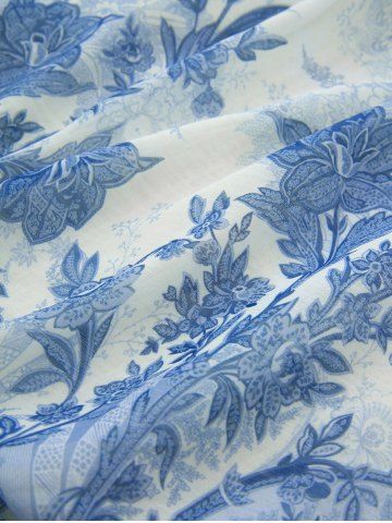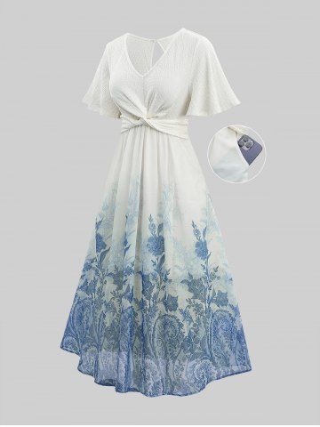 Plus Size Blue And White Porcelain Flowers Print Twist Hollow Out Back Ruffles Dress - White - 4x | Us 26-28