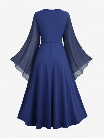Plus Size Cross Zipper PU Strap Buckle Chiffon Textured Flare Sleeve Ruffles A Line Dress - Deep Blue - L | Us 12