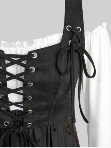 Plus Size Floral Flocking Ruffles Lace Up Poet Sleeves Cold Shoulder High Low Dress - Black - 3x | Us 22-24
