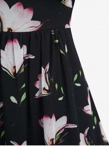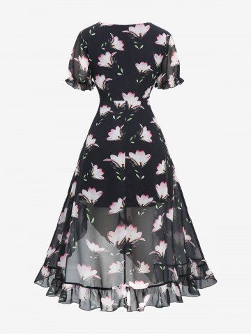 Plus Size Floral Leaf Print Ruffles Layered Chiffon Asymmetric A Line Midi Dress - Black - L | Us 12