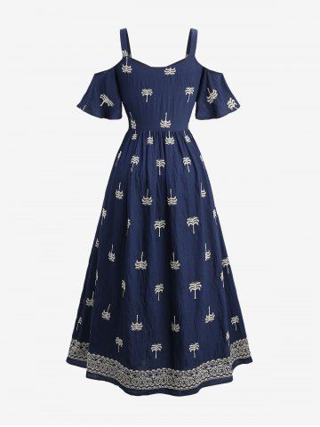 Plus Size Floral Pattern Coconut Tree Embroidery Twist Cold Shoulder Dress - Deep Blue - 2x | Us 18-20
