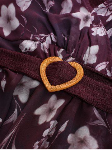 Plus Size Flowers Print Heart Buckle Surplice Butterfly Sleeves Ribbed Textured Dress - Deep Red - 2x | Us 18-20