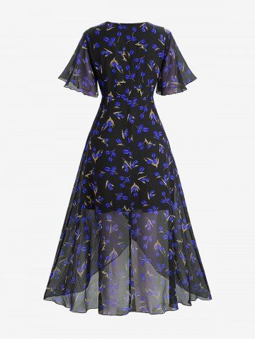 Plus Size Flowers Print Ruffles Surplice Tulip Hem Chiffon Dress - Indigo Color - L | Us 12