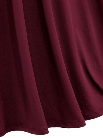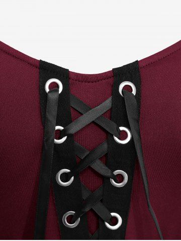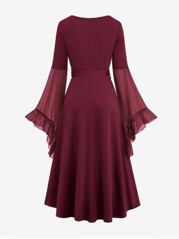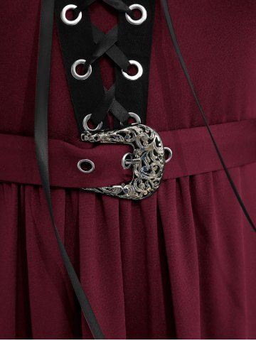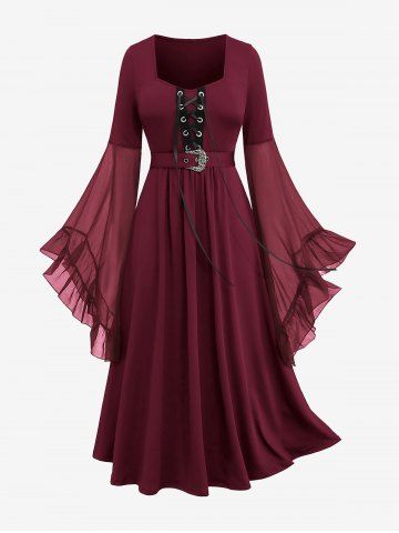 Plus Size Medieval Renaissance Grommets Lace Up Mesh Bell Sleeves Buckle Belt Dress - Deep Red - L | Us 12