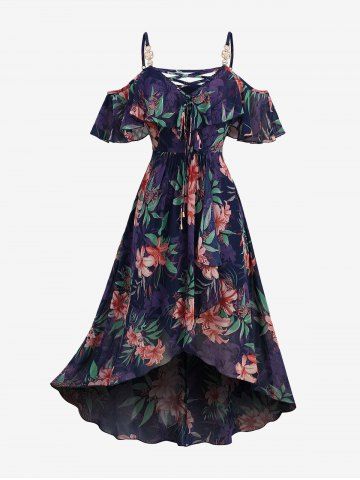 Plus Size Hibiscus Flower Print Lace Trim Lattice Braided Ruffles Tulip Hem Cold Shoulder High Low Dress - Deep Blue - 3x | Us 22-24