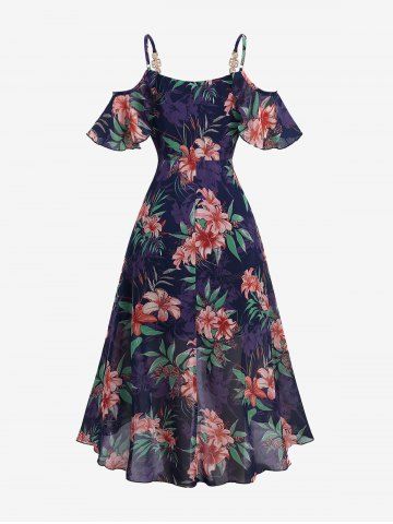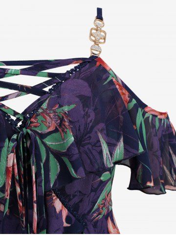 Plus Size Hibiscus Flower Print Lace Trim Lattice Braided Ruffles Tulip Hem Cold Shoulder High Low Dress - Deep Blue - 4x | Us 26-28