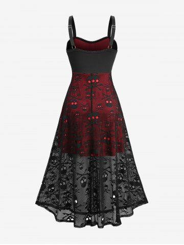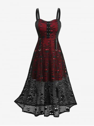 Plus Size Hollow Out Skull Fishnet Lace-up Grommets Lace Trim High Low Tank Dress - Red - 1x | Us 14-16