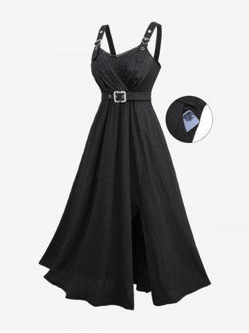 Plus Size Lace Trim Grommets Heart Buckle Split Surplice Ruched Plisse Dress - Black - L | Us 12