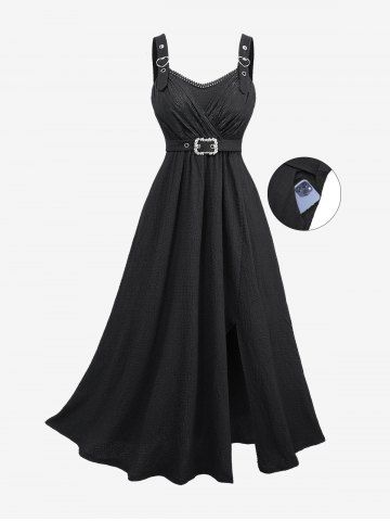 Plus Size Lace Trim Grommets Heart Buckle Split Surplice Ruched Plisse Dress - Black - 2x | Us 18-20