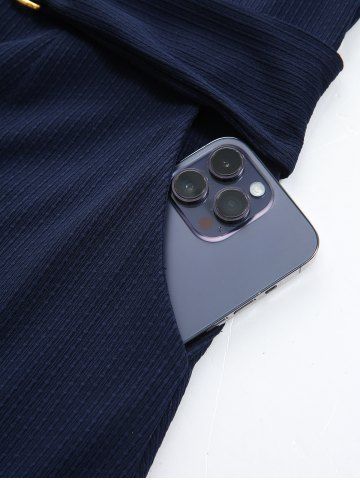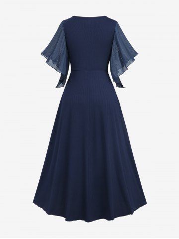 Plus Size Lace Trim Heart Buckle Pocket Silver Plisse Patchwork Butterfly Sleeve Dress - Deep Blue - L | Us 12