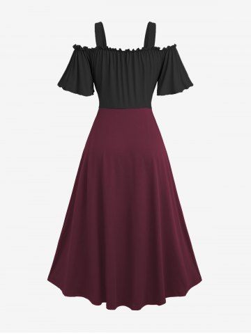 Plus Size Medieval Renaissance Cold Shoulder Ruched Ruffles Colorblock Lace Up Belted Vintage Corset A Line Dress - Red Wine - 1x | Us 14-16