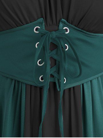 Plus Size Medieval Renaissance Cold Shoulder Ruched Ruffles Colorblock Lace Up Belted Vintage Corset A Line Dress - Dark Turquoise - 1x | Us 14-16