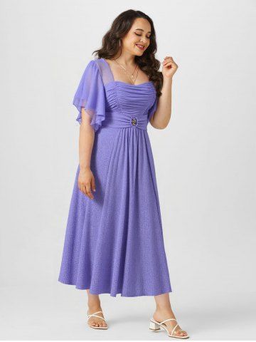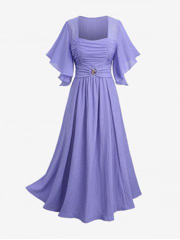 Plus Size Ruched Buckle Butterfly Sleeves Plisse Dress - Light Purple - L | Us 12