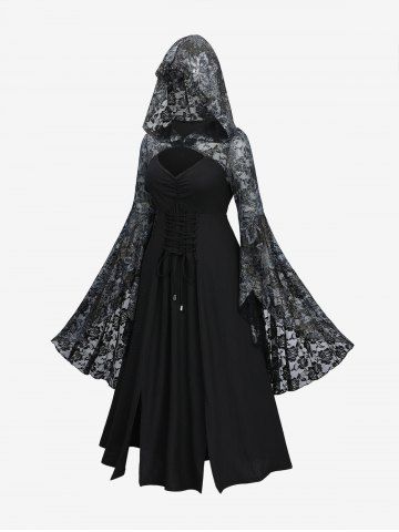 Plus Size Ruched Lace-up Rose Flower Lace Flare Sleeves Split Hooded Dress